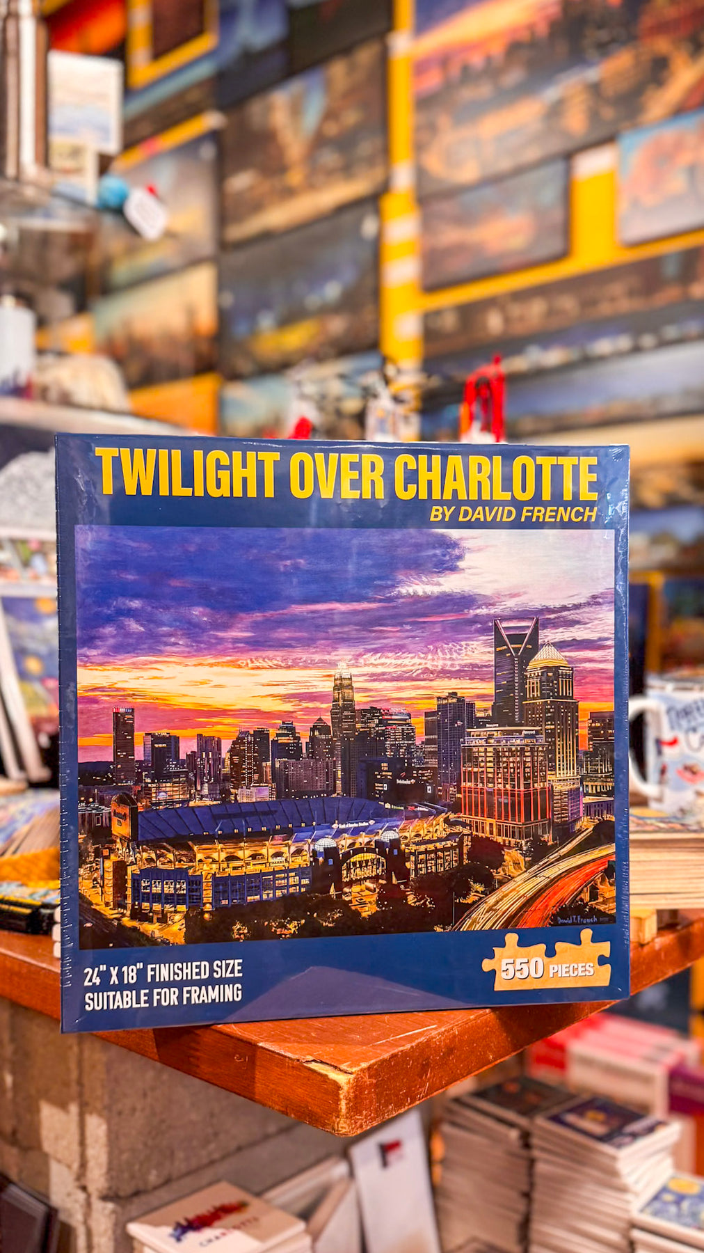 From local artist David French, feel the city come alive as you piece together this enchanting 550-piece puzzle featuring a panoramic view of Charlotte at twilight. From the shimmering windows of uptown skyscrapers to the illuminated arches of Bank of America Stadium and the flowing light trails along the highways—each section offers a new slice of urban beauty.