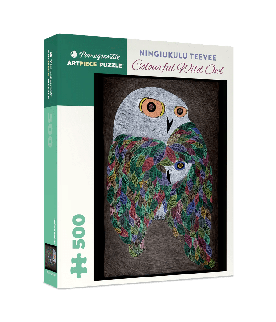 Ningiukulu Teevee (Canadian, Inuit, b. 1963) Colourful Wild Owl, 2013 Inspired by tales she heard as a child and largely self-taught, Inuit artist Ningiukulu Teevee brings the animals and legends of the far north to life. In Colourful Wild Owl, reproduced for this 500-piece puzzle, she playfully portrays a sly, multi-colored owl, which seems to be hiding a pal, or an owlet, or a mate? Teevee often melds representation with abstraction in her work.