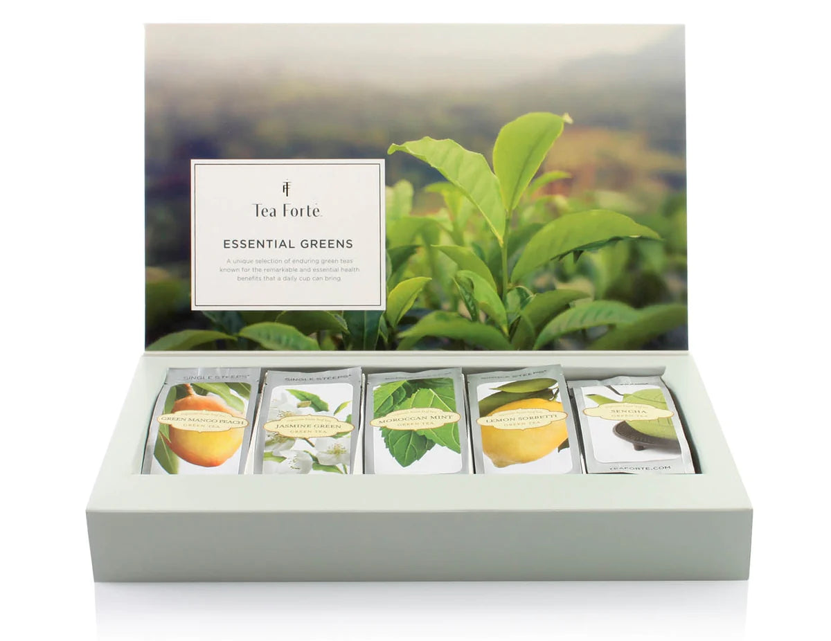 Essential green teas are known for the remarkable and essential health benefits that a daily cup can bring. Includes fifteen pre-measured loose leaf tea pouches, three each of the following blends: Green Mango Peach, Sencha, Moroccan Mint, Jasmine Green, Lemon Sorbetti. See below for blend descriptions.