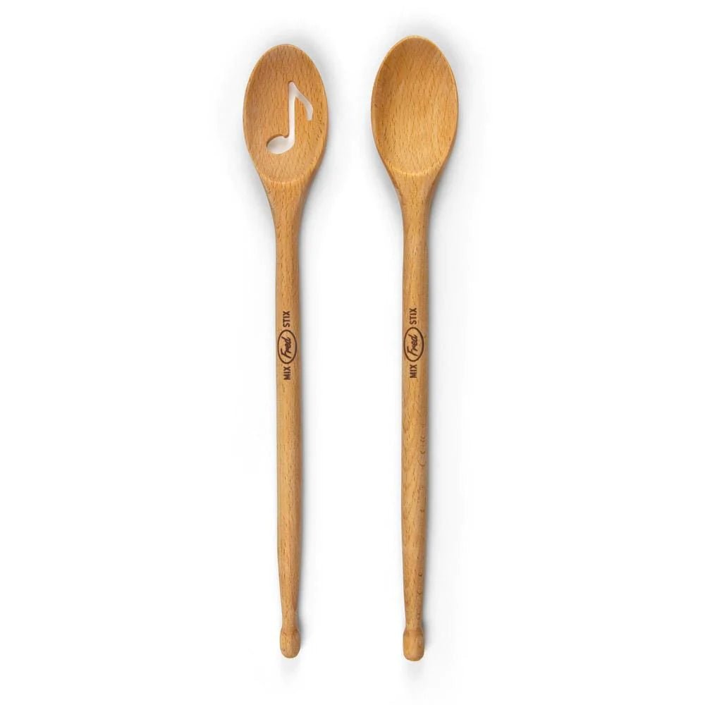 Mix Stix are classic, indispensable beechwood spoons, morphed into drumsticks. So you can rock out when you're not stirring, paradiddle on the stockpot, give that mixing bowl a rimshot. Get with the beat! Each spoon measures 13 inches long.